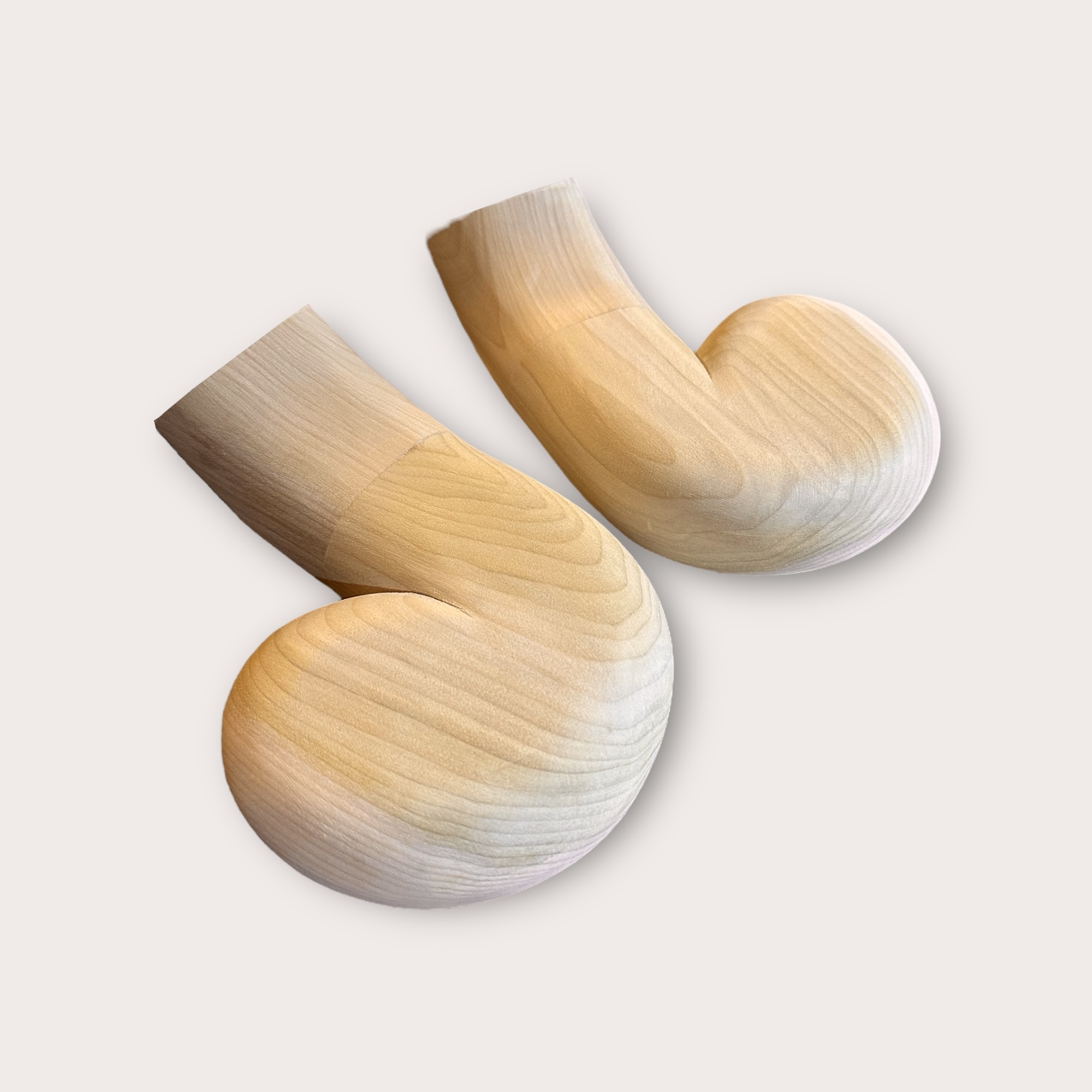 Shown in tulipwood, both left and right versions, this small volute can be used in without a full bullnose step. The pin top newel can be fastened directly to the outside of the stair string.